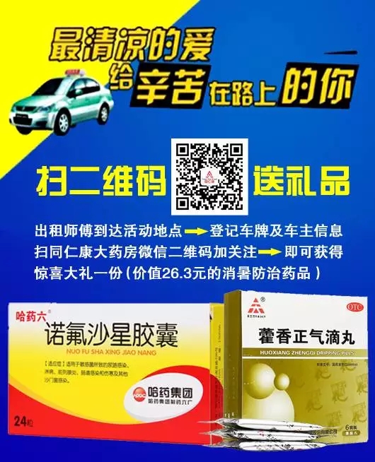山西同仁康大藥房太原市與孝義市各藥房在7月7日--9日為“的哥、的姐”送上我們***真摯的祝愿,我們?yōu)槟呐谥屏讼顩霾韫┠赓M(fèi)飲用。并且現(xiàn)場(chǎng)掃碼即可獲贈(zèng)價(jià)值26.3元的消暑防治藥品(天士力集團(tuán)的藿香正氣滴丸和哈藥集團(tuán)的諾氟沙星膠囊),同時(shí)現(xiàn)場(chǎng)還免費(fèi)贈(zèng)送您價(jià)值5元的優(yōu)惠券四張,持此券您可在山西同仁康各藥房特惠購藥。